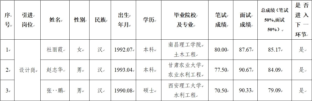 2024-10-20根据《平凉市泾东水利水电勘测设计有限责任公司2024年特殊人才招聘公告》有关规定,公司对拟录用的3名人员已完成了资格审查、笔试、面试、考察、体检等工作程序,现予以公示,接受社会各界监督。如发现在德、能、勤、绩、廉等方面有影响录用的问题,可通过电话、手